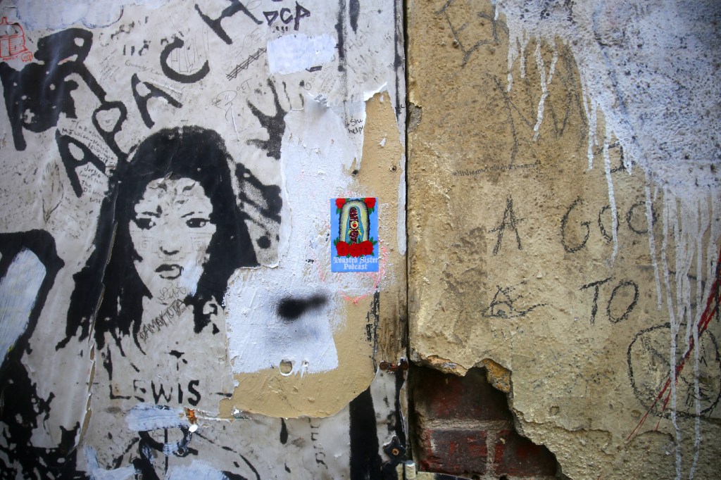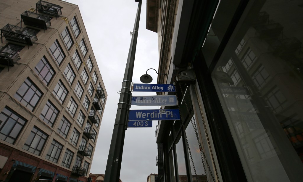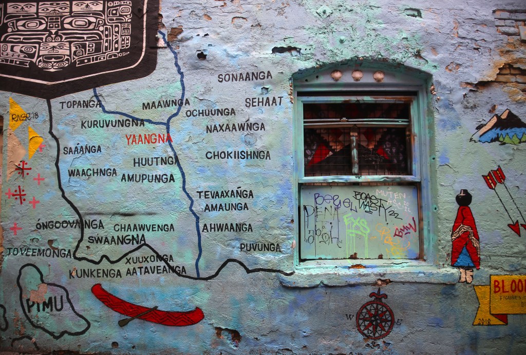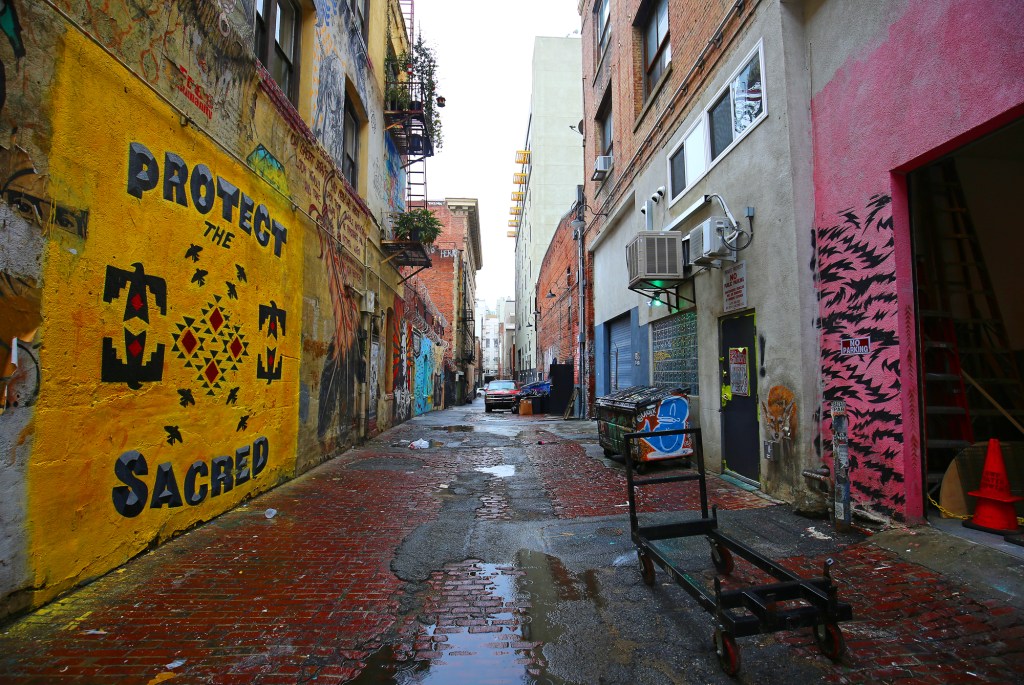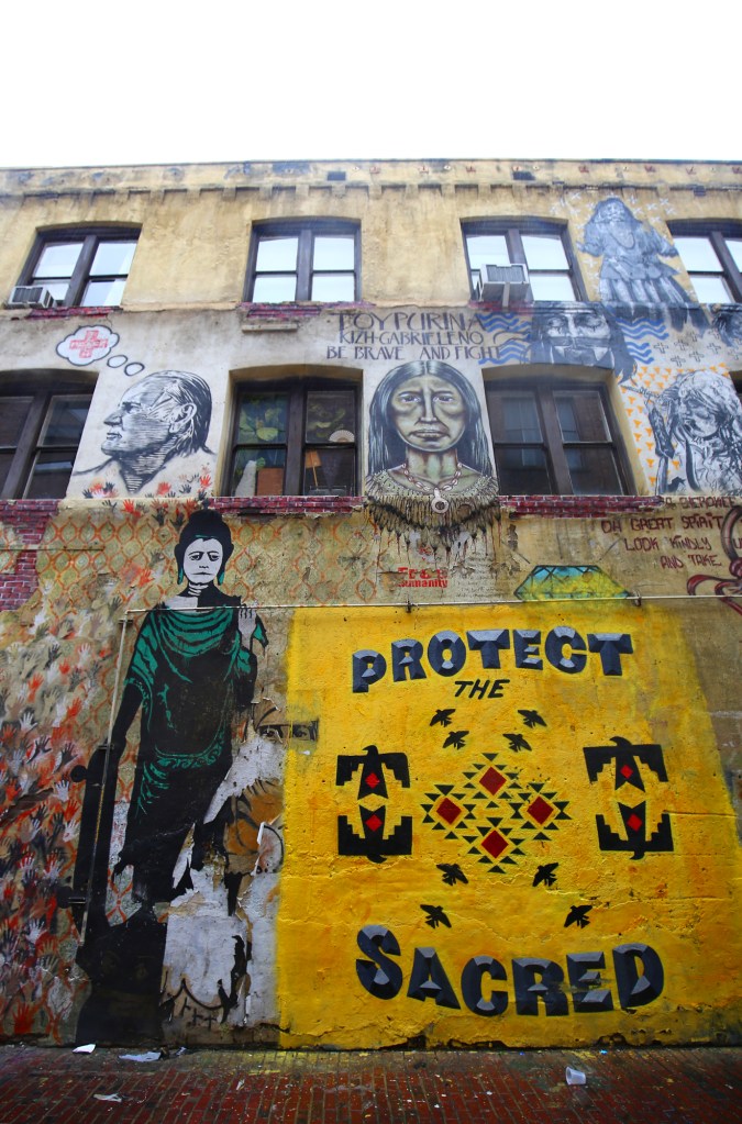 ANDI: We eventually make our way to Skid Row to Indian Alley. We’re huddled together under an umbrella in the alley, which is now a well-known Native art wall.